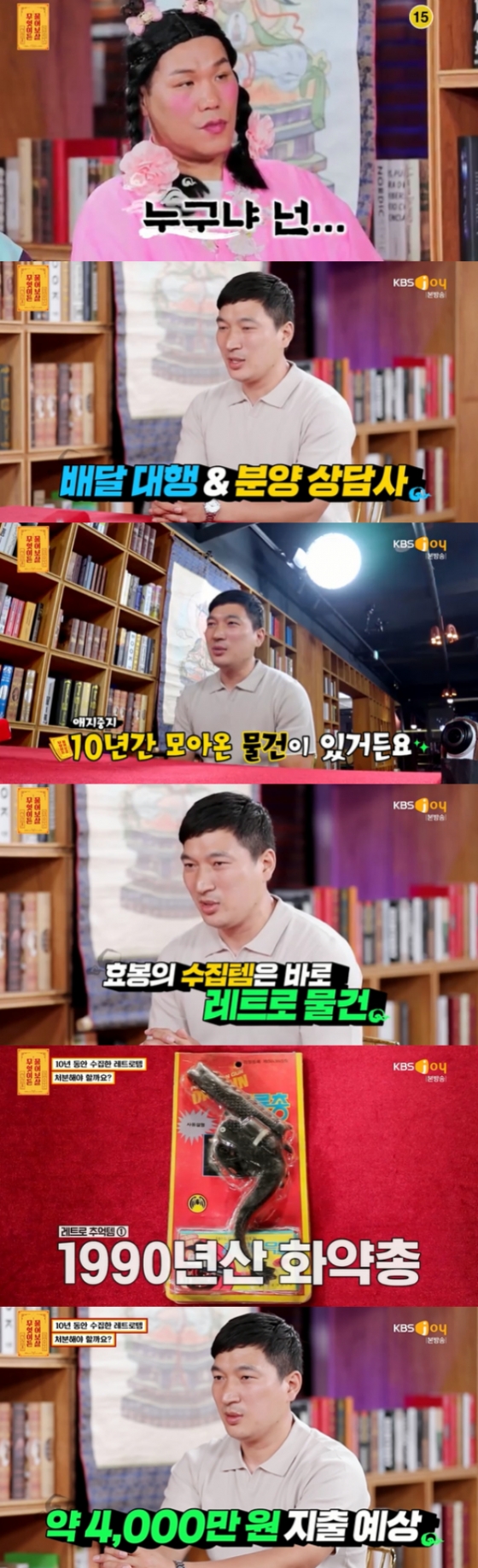 이날 고민의 주인공은 배달대행과 분향 상담사의 직업과는 반대로 특별한 취미가 있다고 말해 궁금증을 자아냈다. 고민의 주인공은 "10년간 모아온 물건이 있거든요"라며 입을 열었다. MC 서장훈은 "무슨 물건인데?"라며 궁금해했고 "레트로 물건이요"라고 답했다.