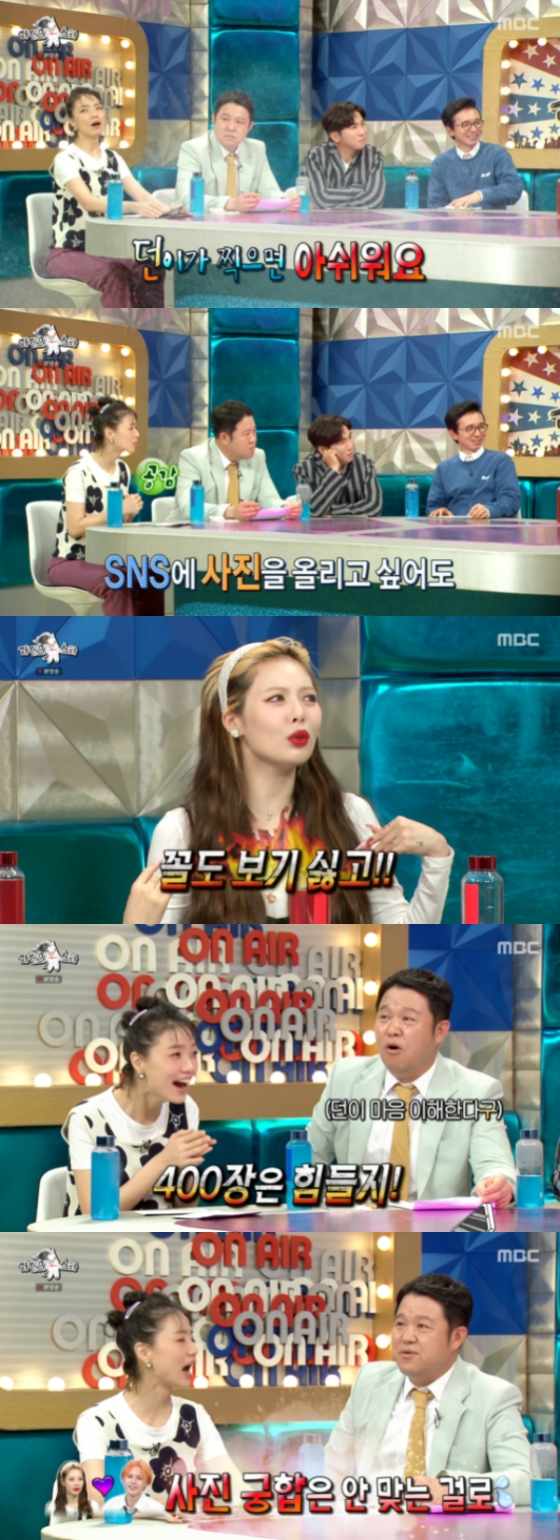 '라디오스타'에서 가수 현아가 던이 찍어주는 사진이 마음에 들지 않는다고 전했다.