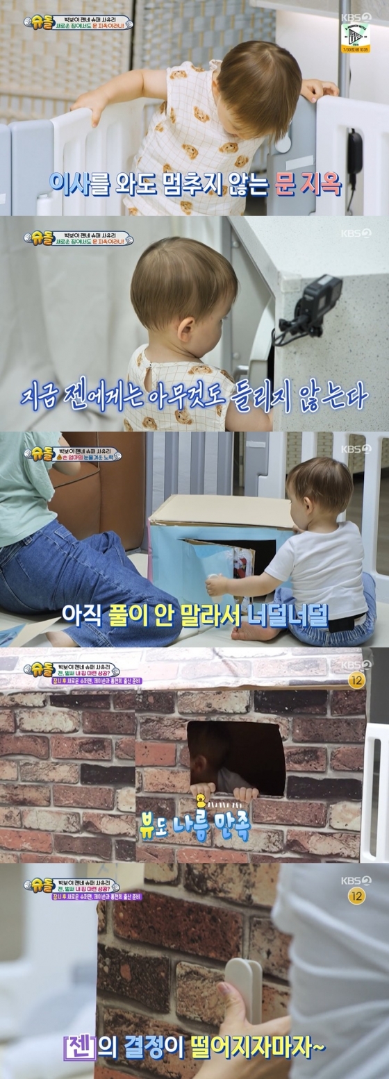 하지만 젠은 사유리가 만든 종이박스 장난감의 문에 관심이 없고, 몸을 넣기 바빴다. 사유리는 이를 보며 젠이 들어갈 수 있는 '박스 집'을 만들어주며 진땀 흘리는 육아를 했다.