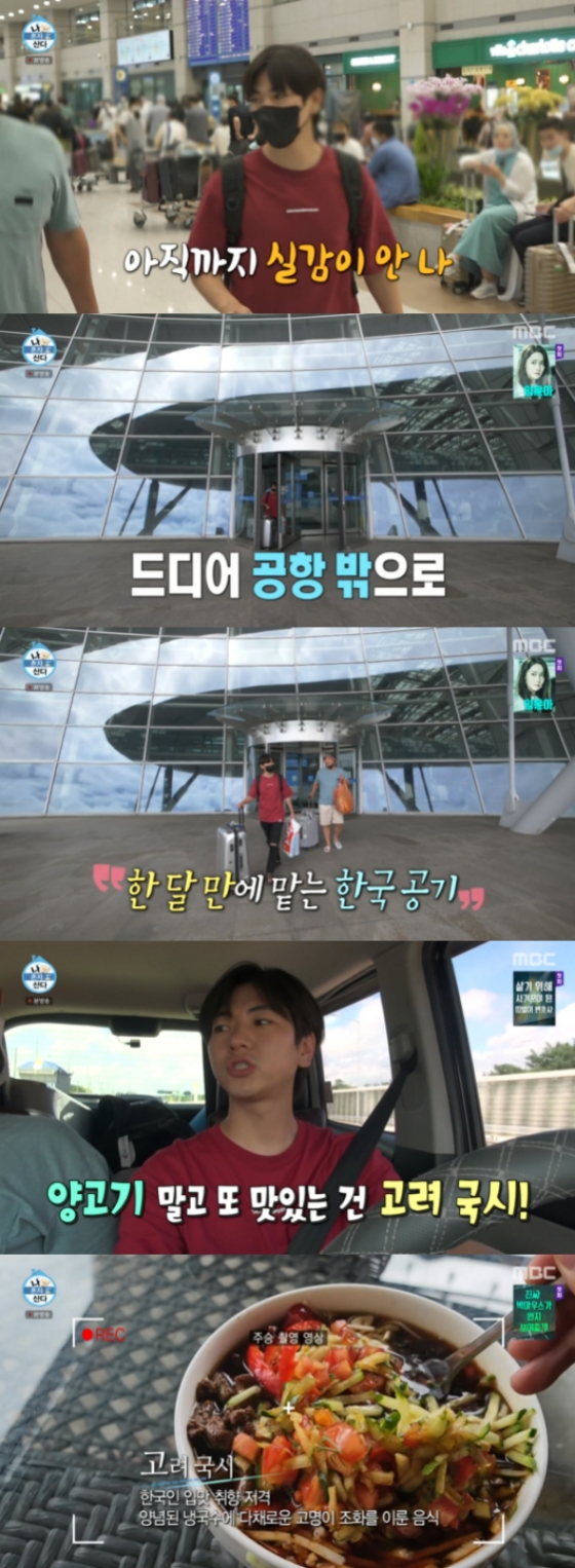 이주승은 공항 밖을 벗어나 한 달 만에 맡는 한국 공기에 설레는 모습을 보였다. 박나래는 "공기는 카자흐스탄이 훨씬 좋죠?"라고 물었고 이주승은 "카자흐스탄은 습하지가 않아요"라며 차이점을 말했다.