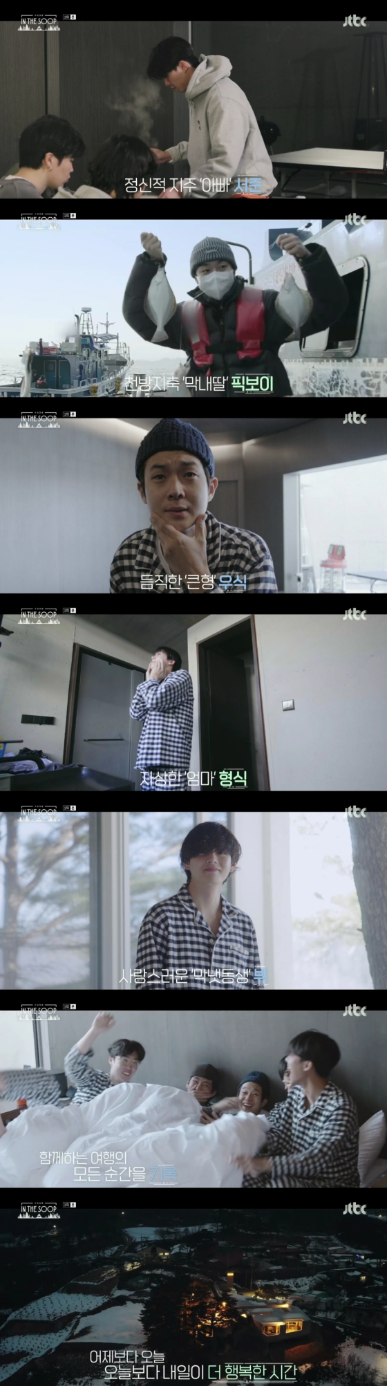 '정신적 지주 아빠' 박서준, '천방지축 막내딸' 픽보이, '듬직한 큰형' 최우식, '자상한 엄마' 박형식, '사랑스러운 막냇동생' 뷔를 소개하며 여행은 시작됐다.