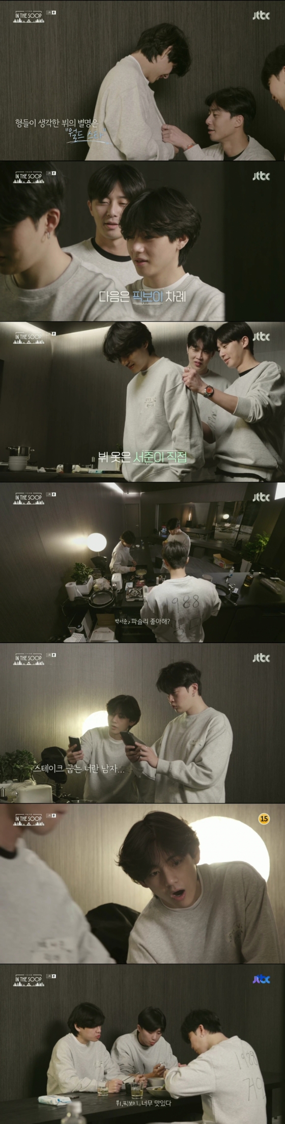 박서준은 스테이크와 매시드 포테이토를 만들었고, 파슬리를 더 넣어달라는 뷔에게 박서준이 "파슬리 좋아해? 파슬리도 너 좋아할걸?"이라고 말해 흐뭇함을 안겼다. 뷔는 "스테이크 굽는 너란 남자...참 마음에 든다"며 사진을 찍었고, 픽보이와 뷔는 요리가 맛있다고 연신 칭찬했다.