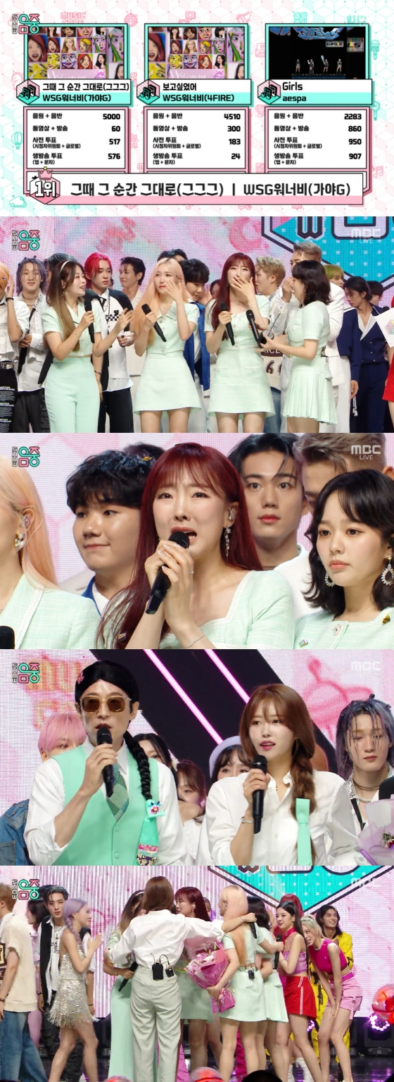 23일 방송된 MBC '쇼! 음악중심'에서 7월 넷째 주 1위 후보로 WSG워너비 가야G(이보람, 소연, HYNN(박혜원), 정지소)의 '그때 그 순간 그대로(그그그)', WSG워너비 4FIRE(나비, SOLE(쏠), 엄지윤, 권진아) '보고싶었어', 에스파의 'Girls'가 올랐다.