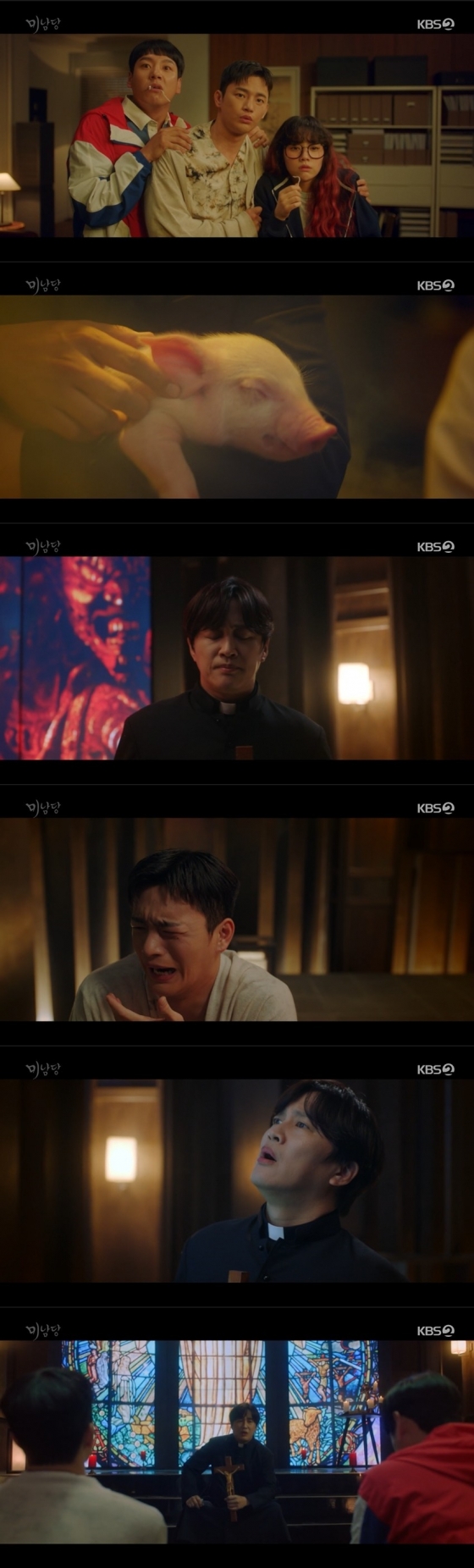 26일 오후 방송된 KBS 2TV 월화드라마 '미남당'에서는 신부님(차태연 분)이 남한준(서인국 분)의 어머니의 의뢰를 받고 구마식을 위해 남한준을 찾아가는 모습이 담겼다.