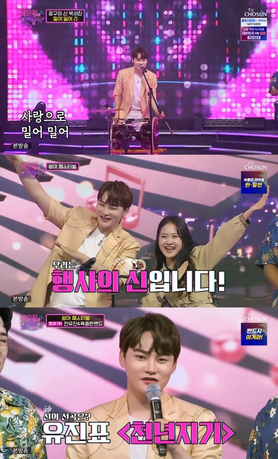 MC 붐과 장민호의 소개로 장구와 함께 화려하게 등장한 박서진은 흥을 돋우는 '밀어 밀어' 라이브는 물론, 시선을 압도하는 장구 퍼포먼스로 출연진들의 뜨거운 환호와 박수 세례를 받았다.