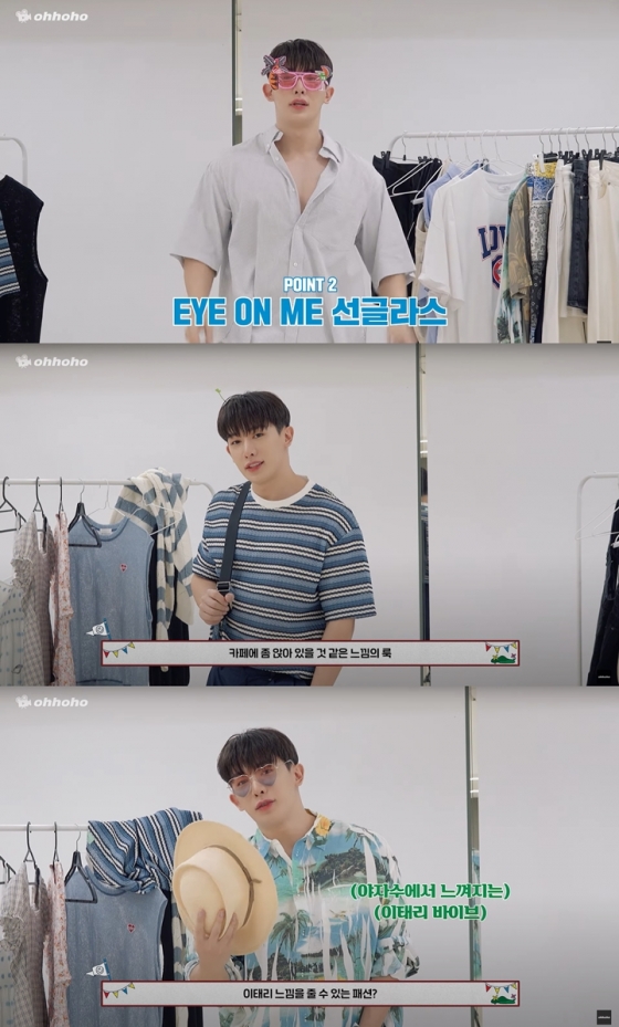 첫 번째로 베이지 계열 의상에 핑크 선글라스로 포인트를 준 원호는 직접 입어본 뒤 "아마 올여름 가장 패셔너블하고 트렌디한 바캉스 룩이 아닐까 생각이 든다"고 너스레를 떨어 웃음을 자아냈다.
