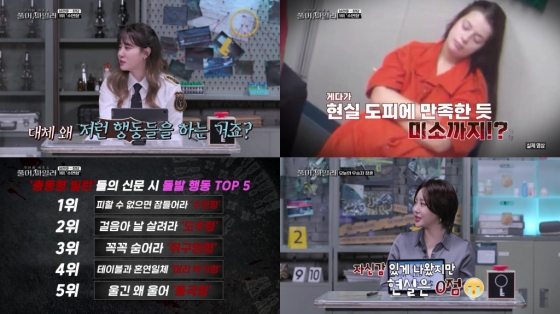 경찰의 신문을 받던 범죄자들의 엽기 행각 유형으로 통곡형, 머리 박기형, 도주형 등 두 눈을 의심하게 만드는 모습들이 공개됐다. 그중 '최악'의 1위는 신문 중 수면을 취하는 범죄자로, 자는 척하며 입가에 미소 짓는 행동에 출연진들은 경악을 금치 못했다. 이에 김민아는 "경악스럽다"며, "1위로 갈수록 도저히 이해할 수 없는 행동이 나온다"고 고개를 내저었다.