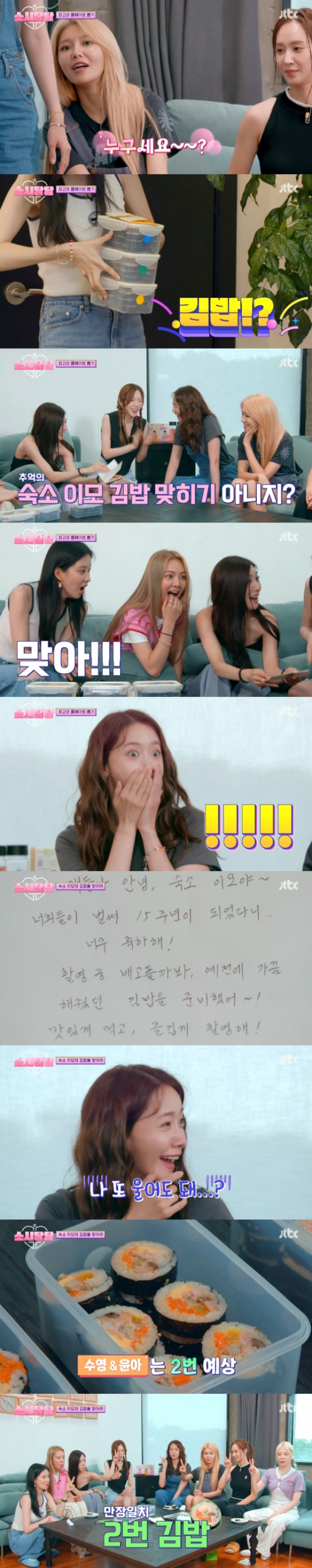 이날 소녀시대는 울리는 초인종 소리에 "뭐야"라며 궁금해했다. 티파니 영은 "누가 와?"라고 물었다. 서현은 현관문에 놓여있는 의문의 김밥 3통을 들고왔다. 윤아는 "이거 막 숙소 이모가 해준 김밥 이런 거 맞추는 거 아니지"라고 추측했다. 소녀시대는 김밥과 같이 온 편지를 읽고 놀라워했다. '얘들아 안녕 숙소 이모야'라고 적힌 쪽지에 윤아는 "진짜야?"라며 눈시울을 붉혔다.
