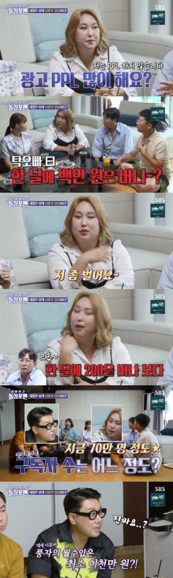 이후 이상민은 풍자의 구독자 수를 물었고 풍자는 70만이라고 답해 놀라움을 안겼다. 김준호는 풍자의 구독자 수를 듣고 "최소 2천만 원 이상이야"라며 월 수익을 추측했다. 풍자는 "이상 이긴 합니다"라고 말해 놀라움을 자아냈다.