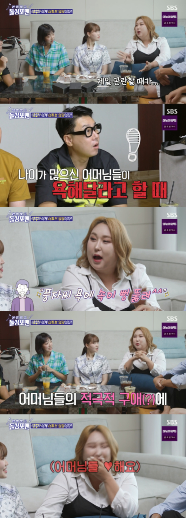 이날 풍자는 평상시에 욕을 많이 하는데 나이가 많은 어머님들이 욕을 해달라고 할 때 곤란하다고 전했다. 풍자는 어머님 구독자들이 집에서 설거지하면서 보는데 뭐가 확 내려가는 느낌이라며 욕을 해달라고 요구하면 울며 겨자 먹기로 욕을 해준다고 전해 웃음을 안겼다.
