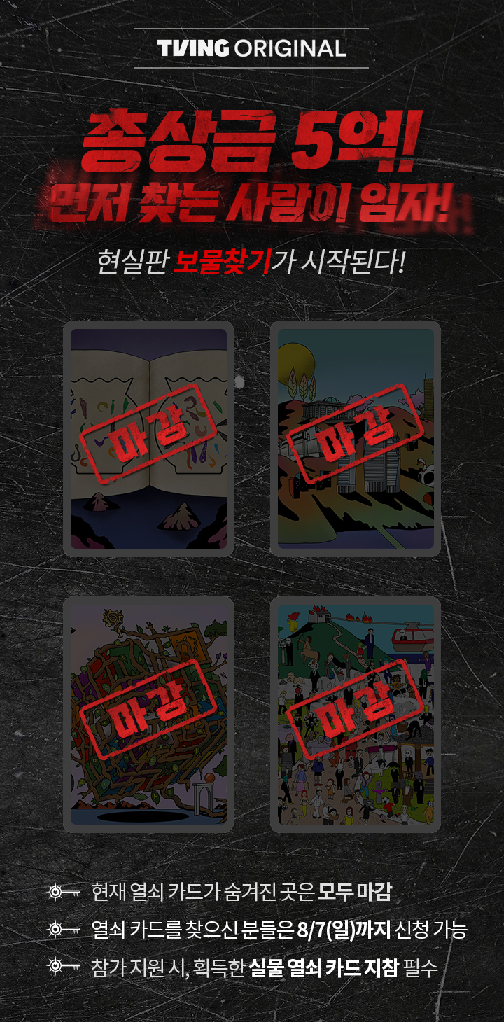총 상금 5억원을 걸고 펼쳐지는 '보물찾기'의 첫번째 관문 숨겨진 열쇠 카드는 현재 모두 발견돼 소진이 완료됐다. 다만 참가자 신청은 8월 7일까지 가능해 열쇠 카드를 찾은 사람은 서둘러 참가 신청을 마무리 해야 한다.