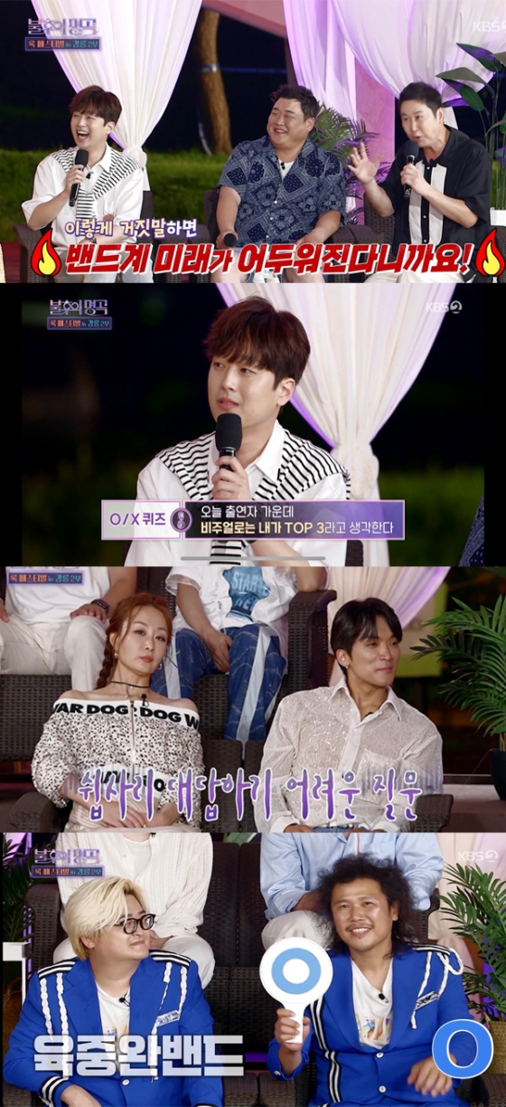 MC 이찬원은 "출연자 가운데 비주얼로는 내가 TOP3 안에 든다고 생각한다"라는 질문을 전 출연자에게 던졌다. 이에 잔나비, 멜로망스 등 다른 밴드의 멤버들은 눈치를 보며 'X'가 적힌 팻말을 들었지만, 육중완은 당당히 'O'가 적힌 팻말을 들어 모두를 당황하게 했다. 신동엽은 "육중완은 거짓으로 판정됐다. 이렇게 되면 밴드계 미래가 어두워진다"과 장난을 쳤고, 출연자들은 전원 폭소했다.