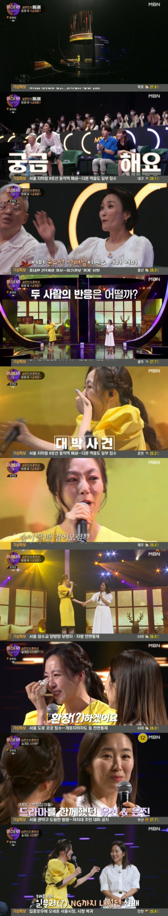 8일 오후 방송된 MBN 예능프로그램 '미스터리 듀엣'에서는 심은진이 듀엣 상대 윤유선을 보고 눈물을 흘리는 모습이 공개됐다.