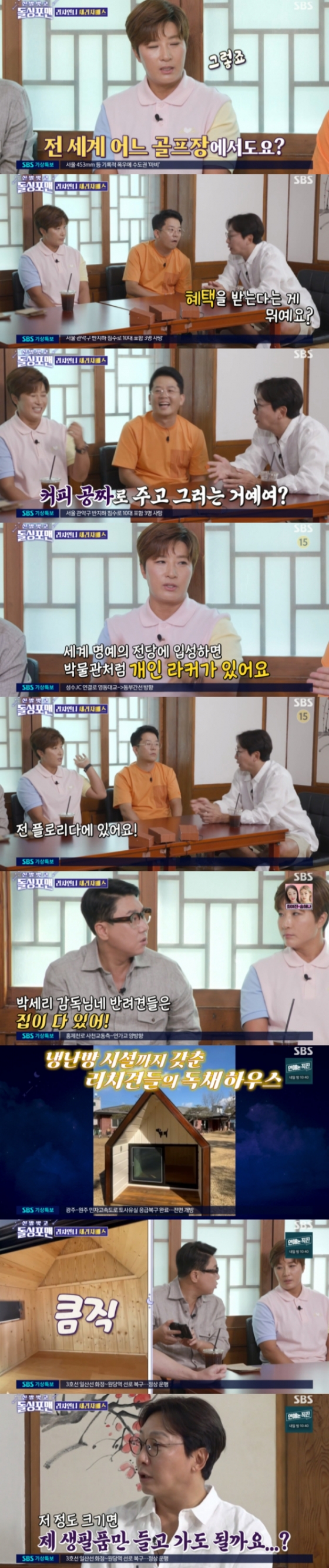 이후 이상민은 "우리 중에 집이 있는 사람이 원희 형님 밖에 없잖아. 근데 박세리 씨 반려견은 집이 다 있어요"라고 전했다. 이후 박세리의 반려견 집이 공개됐고 큼직한 집 크기에 탁재훈은 "저 정도면 내 생필품만 들고 가면 되겠는데"라고 말해 웃음을 안겼다.