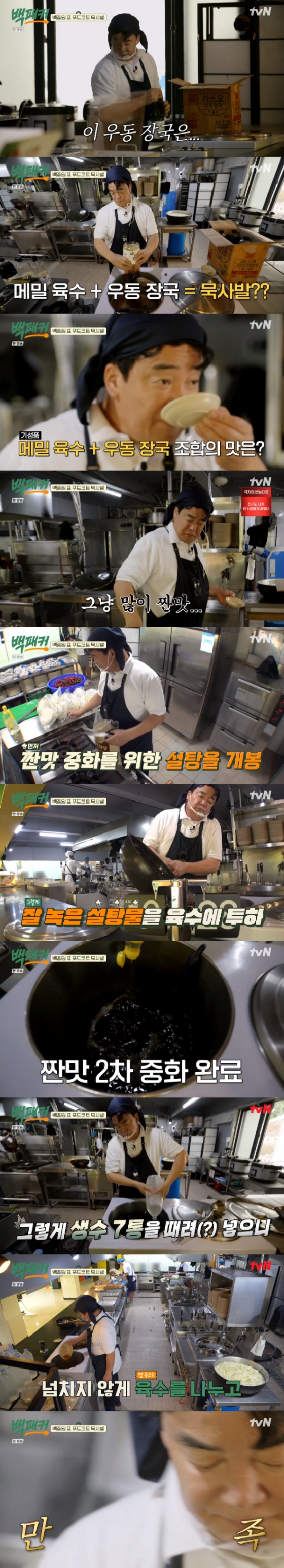 한편 백종원은 묵사발 육수고 고민했다. 백종원은 푸드코트에 있는 우동장국과 메밀 육수를 섞어 묵사발 육수를 만들려고 시도했지만 생각보다 짠맛에 당황했다. 백종원은 "조미해야겠다"라며 맛술과 설탕을 준비했다. 짠맛을 중화시키기 위해 끓는 물에 설탕을 녹여 육수에 투하했다. 이어 맛술과 생수를 넣어 짠맛을 중화시켰다.