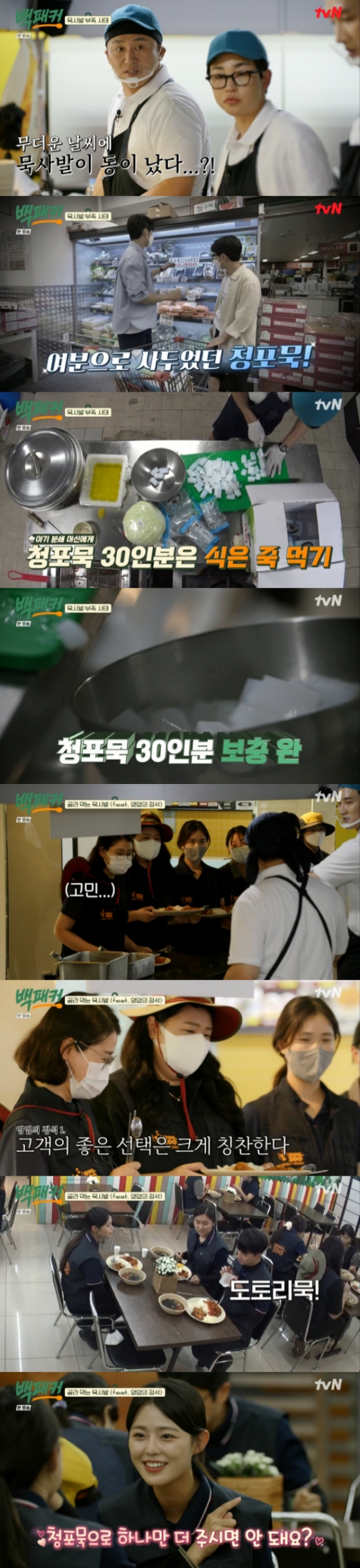 한편 백종원은 묵사발 육수를 고민했다. 백종원은 푸드코트에 있는 우동장국과 메밀 육수를 섞어 묵사발 육수를 만들려고 시도했지만 생각보다 짠맛에 당황했다. 백종원은 "조미해야겠다"라며 맛술과 설탕을 준비했다. 백종원은 짠맛을 중화시키기 위해 끓는 물에 설탕을 녹여 육수에 투하했다. 이어 맛술과 생수를 넣어 짠맛을 중화시켰다.