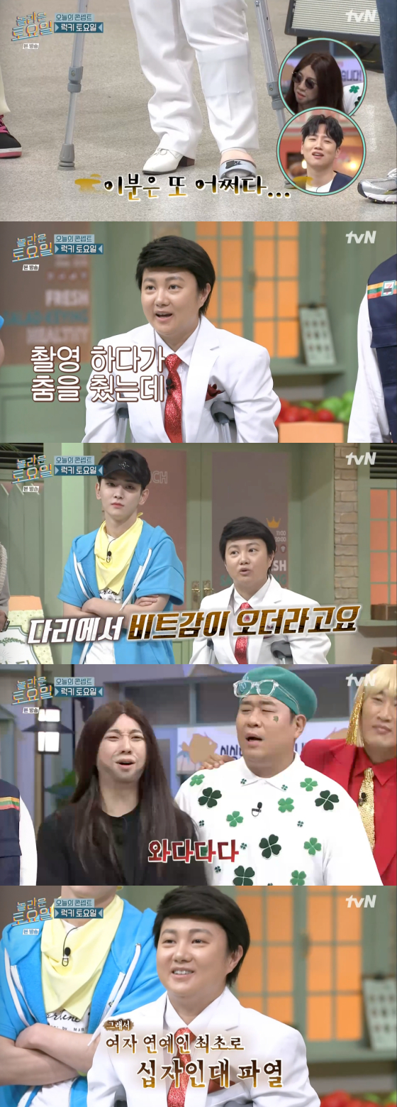 박나래는 "촬영 하다가 춤을 췄는데 다리에서 비트감이 오더라. 와다다다"라며 "여자 연예인 최초로 십자인대가 파열됐다"고 밝혀 폭소를 자아냈다.