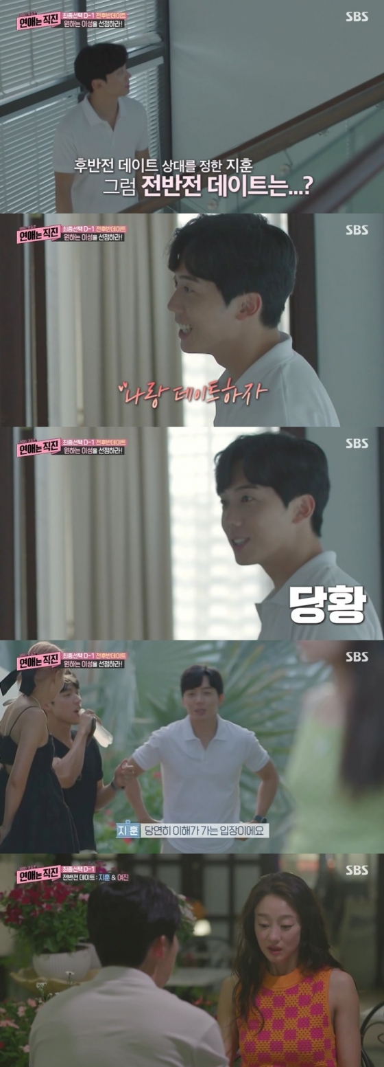 앞서 김지훈은 최윤영에게 전반 데이트 신청을 했지만 거절당했고, 이후 여성 멤버들(최여진 송해나 최윤영 유빈)이 모인 2층으로 향했다. 최여진은 김지훈에게 "지금 바빠?"라고 물었다. 김지훈은 "아니"라고 답했다. 최여진은 모두가 듣는 앞에서 김지훈에게 "나랑 데이트할래?"라고 물었다. 김지훈은 "지금?"이라며 당황했다.