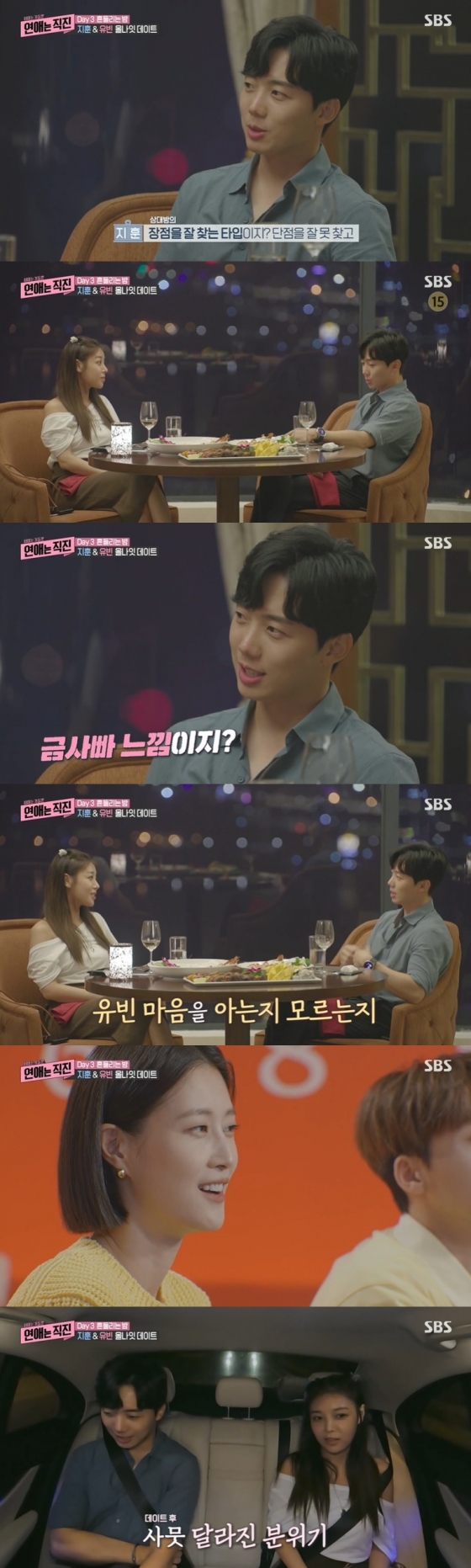 한편 전날 김지훈과 유빈의 1 대 1 데이트에서는 불편한 분위기가 형성했다. 유빈은 김지훈에게 "어떤 스타일의 여자친구를 많이 만났어? 이상형"이라고 물었다. 김지훈은 시큰둥한 반응으로 "웃는 게 예쁜 사람, 애교 있었으면 좋겠고 무뚝뚝한 것보다는?"이라고 답했다. 이어 김지훈은 유빈에게 "너는 (사람마다) 다 다르다고 했잖아"라고 말했다.