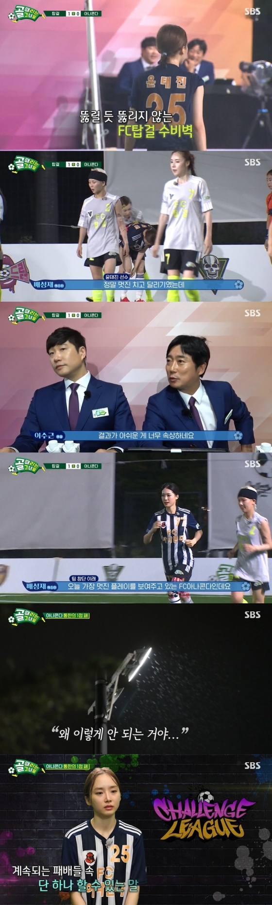 '골 때리는 그녀들'에서 윤태진이 FC아나콘다의 7연패에 눈물을 보였다.