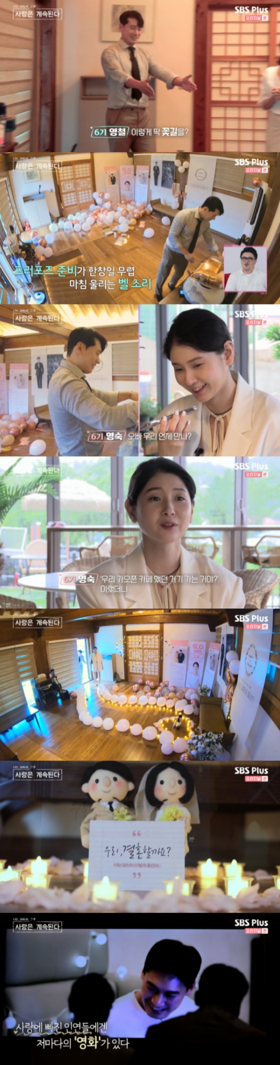 이후 영숙은 프러포즈 장소에 도착해 깔려있는 풍선과 촛불을 보고 감동했다. 영철은 "울어?"라며 영숙의 얼굴을 봤고 영숙은 "울어야 되는데 눈물이 안 나"라며 즐거워했다. 영숙과 영철은 처음 나는 솔로에서 처음 만났던 영상을 시청했다. 영철은 영상 속 영숙이 엄마와 통화하는 모습을 보고 "장모님이 되실 줄 몰랐지"라며 회상했다.