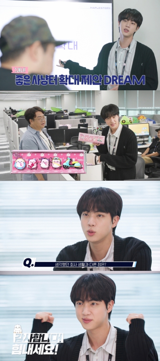 진은 앞서 공개된 '출근용사 김석진' 1화에서 메이플스토리 기획팀 면접과 사원증 촬영, PPT를 준비하는 등 메이플스토리 인턴사원으로 모습을 드러내 화제를 모았다.