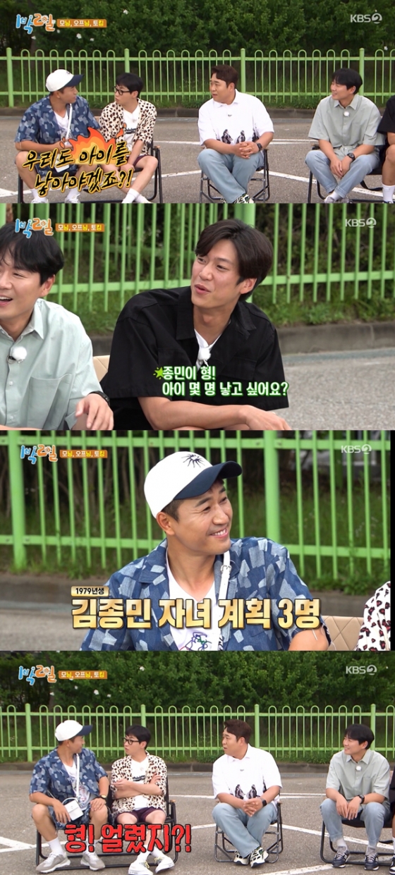 이에 김종민은 갑자기 "우리도 애를 낳아야겠죠?"라고 질문을 던졌고, 멤버들은 뜬금없는 김종민의 질문에"무슨 토크야 이거는?" 이라 하면서 당황하는 표정을 지었다. 이어 그럼 몇 명 낳고 싶냐는 나인우의 질문에 김종민은 곧바로 3명이라 답했다.