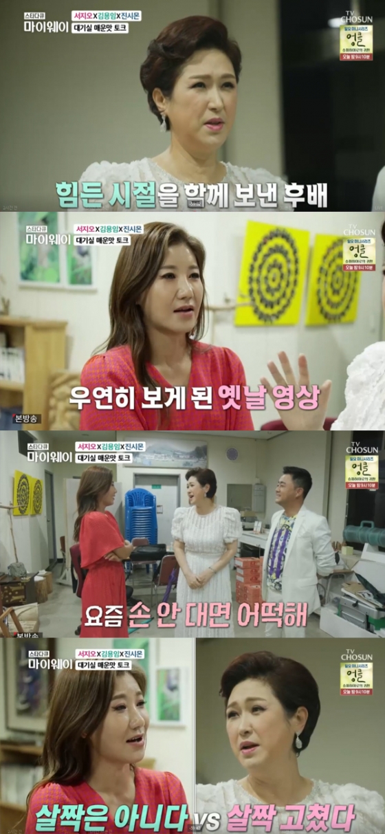 이날 서지오는 무대 오르기 전 대기실에서 친한 선배 가수 김용임, 진시몬과 만나 매운맛 토크를 펼쳤다.