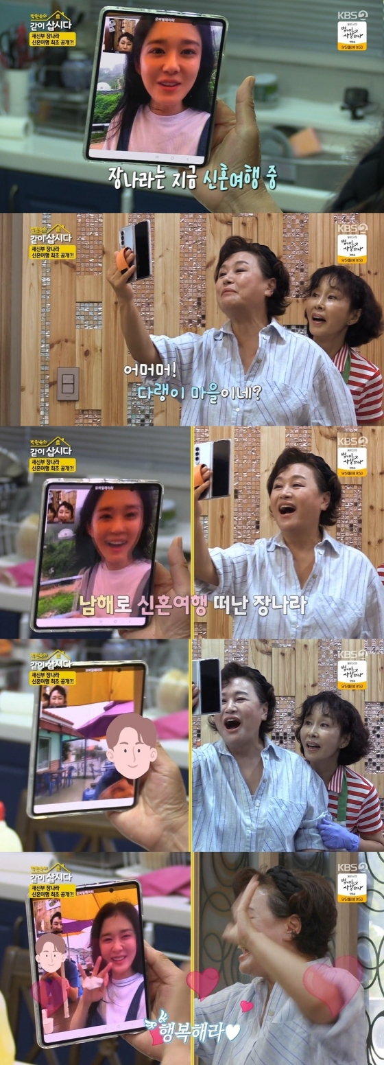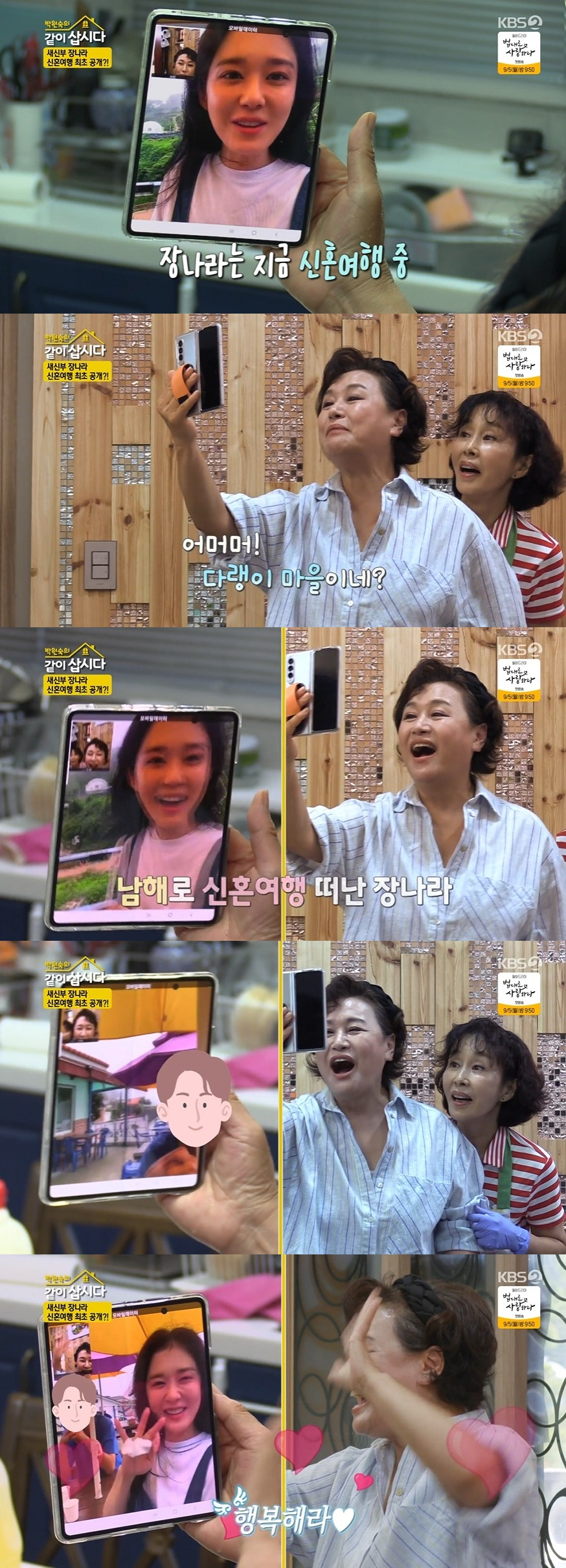 23일 오후 방송된 KBS 2TV 예능프로그램 '박원숙의 같이 삽시다'에서는 남해로 신혼여행 간 장나라가 박원숙에게 영상통화를 하는 모습이 공개됐다.