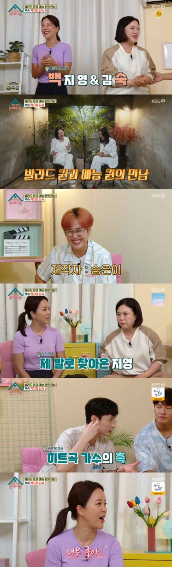 한편 민경훈은 백지영에 "누나는 히트곡이 많은데 감이 왔었냐"고 물었다. 백지영은 "감이 안 좋다"며 히트곡 대부분이 맘에 들지는 않았다고 전해 충격을 안겼다. 김숙은 "백숙의 '그여자가 나야'는 어떻냐"고 물었고 백지영은 "이건 너무 좋아"라고 해 김숙이 실망했다.