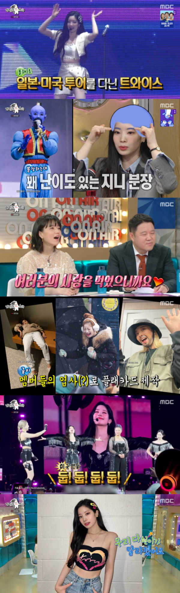 다현은 "일본 같은 경우에는 '밥을 안 먹었다고' 하면 다들 걱정을 해준다. 그러면 '괜찮다. 여러분의 사랑을 먹었다'라고 하면 엄청 좋아한다"고 전해 웃음을 유발했다. 다현은 "미국은 특별한 특징이 있는데 플래카드를 만들어 주시는데 예쁜 사진이 아닌 엽사 사진을 캡쳐한다"며 전했다. 다현은 "별명이 두부인데 그래서 "둡 둡 둡" 이렇게 외친다"고 말해 웃음을 자아냈다.