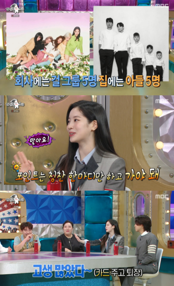 한편 임창정은 다현에게 "회사에는 5명의 걸그룹이 있고 집에는 5명의 남자가 있다"며 걸그룹을 대하는 법에 대해 물었다. 다현은 "'이 아이가 염색을 했다'하면 '아 너무 예쁘다'라고 해줘야한다"고 전했다. 김구라는 "한마디만 해야 된다. 말이 길어지면 안된다"고 설명을 더했다. 이어 다현은 임창정에 "공연 후 '너희들 고생 많았다'하고 카드를 줘야한다"며 걸그룹과 친해지는 방법을 알려줬다.