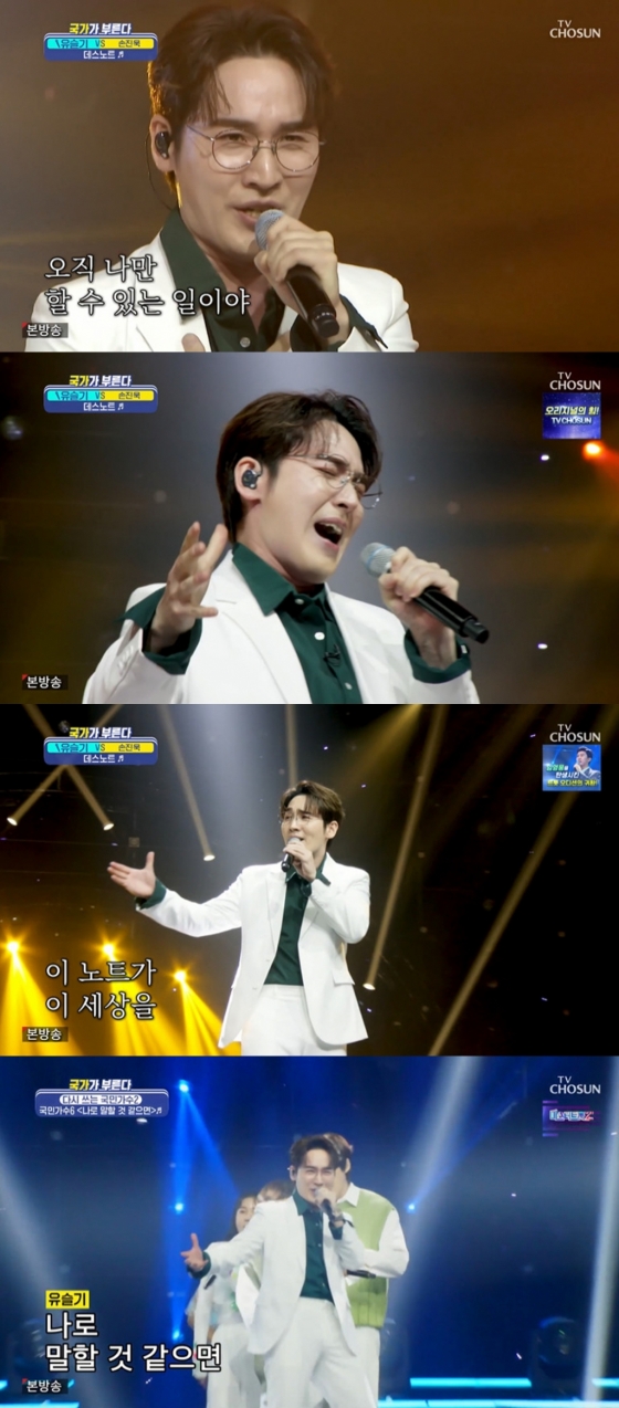 이날 '국가가 부른다'는 '다시 쓰는 국민 가수 2'를 주제로 방송이 진행됐다. '국가가 부른다'는 '내일은 국민 가수'의 스핀 오프 프로그램으로, '내일은 국민 가수' 톱 10안에 든 가수들이 국민들이 원하는 곡을 부르는 방송. 유슬기는 톱 10 중 7위 손진욱에 도전해 순위 쟁탈전을 벌였다.