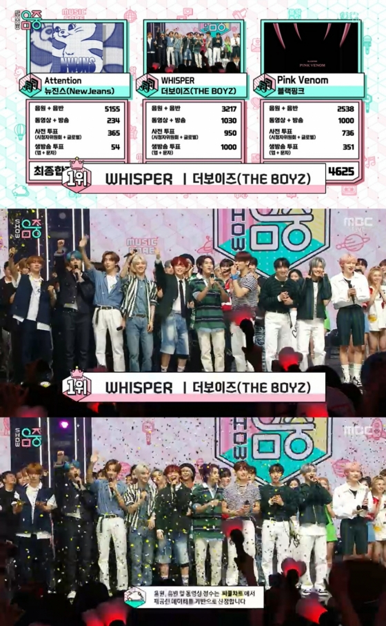 이날 1위 후보로는 뉴진스의 'Attention', 더보이즈 'WHISPER', 블랙핑크의 'Pink Venom'이 올랐다. 더보이즈는 뉴진스와 블랙핑크를 제치고 당당하게 1위 트로피를 차지했다.