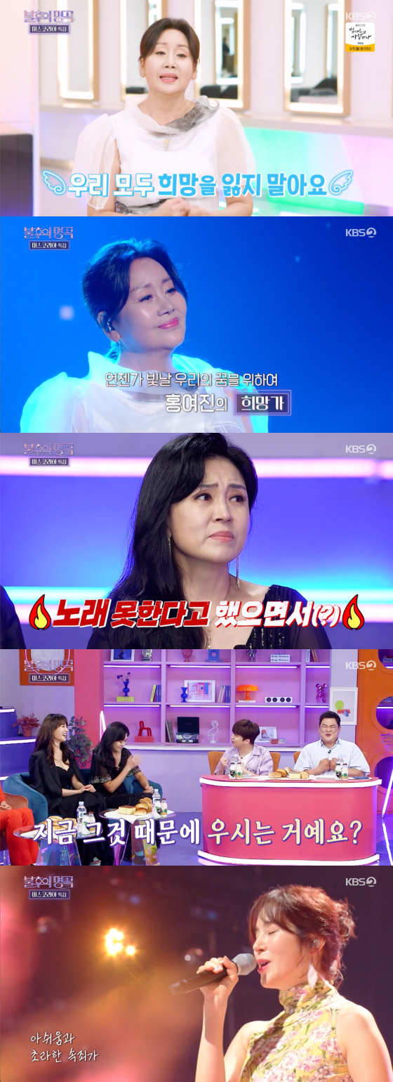'희망가'를 선곡했다던 홍여진은 이어 "음대 가는 줄 알았다"며 가사가 빼곡히 적힌 노트를 공개해 대기실을 깜짝 놀라게 했다. 홍여진은 "미스코리아가 된 지 43년이 됐다. 지나보니 모두가 다 꿈 같더라"며 암 투병 이후의 힘들었던 시절을 회상하며 "희망을 드리고 싶었다"고 전해 눈길을 끌었다. 감동의 무대에 대기실은 덩달아 눈물바다가 됐다. 특히 권정주는 "자기 인생을 노래하는게 와닿았다"고 눈물의 소감을 전했다.