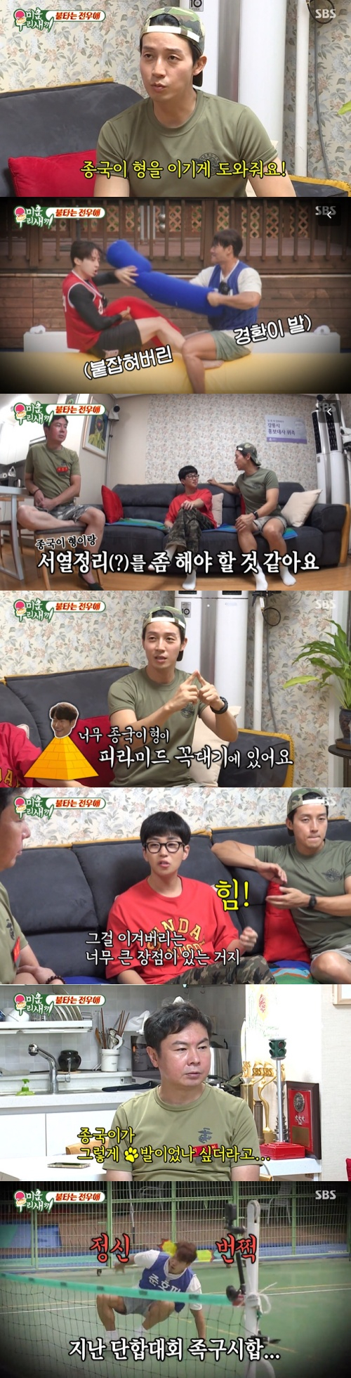 임원희는 "저번 족구할 때 놀랐다. (종국이가) 그렇게 개발이었나 싶더라고"라고 말하며 김종국의 약점을 분석했다. 이어 허경환을 필두로 작당 모의에 돌입한 세 사람은 김종국의 약점 분석은 물론 가상 시뮬레이션까지 선보이는 등 황당한 작전을 세워 모두를 폭소케 했다.