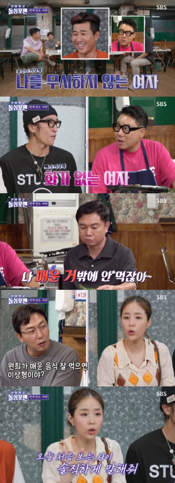 탁재훈은 신지에 "만약에 원희가 매운 음식을 잘 먹어 그럼 이상형이야?"라고 물었다. 신지는 "이상형이 될 수 있다"라고 답했다. 하지만 신지는 방송에서 본 이미지로는 "싫다"고 답해 웃음을 자아냈다. 임원희는 신지의 말에 먹던 고추를 던져 웃음을 안겼다. 신지는 "여자 게스트에게 다 호감을 표했다. 타인에게 좋은 사람 말고 나에게 좋은 사람이 좋다"라며 임원희가 이상형이 아닌 이유를 밝혔다.