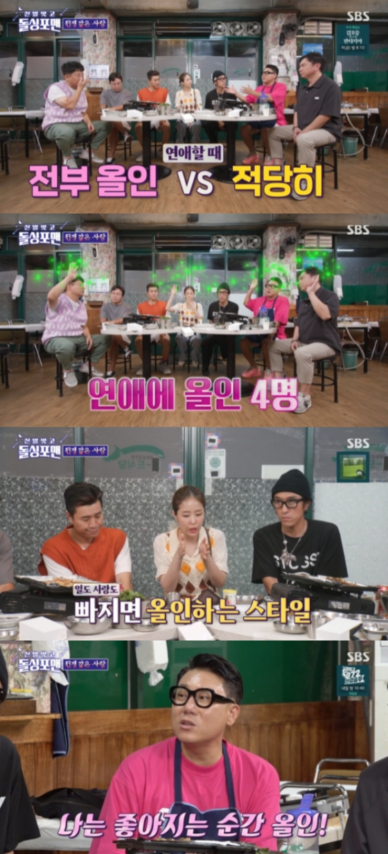 한편 이상민은 '돌싱포맨'멤버들과 코요태에 "연애할 때 '올인하는 게 맞다' 아니면 '적당히 하는게 맞다'"라고 물었다. 빽가는 "올인 한번 손들어 보겠어요?"라고 했고 4명(김준호, 신지, 임원희, 이상민)이 손을 들어 놀라움을 자아냈다. 손을 든 김준호는 "지민이를 위해서 나의 취미를 다 줄이고 있잖아"라고 답했다. 이상민은 "신지는 올인하는 스타일이야?"라고 물었다. 신지는 "제 성격이 그런 거 같다. 일도 그렇고 빠지면 올인하는 스타일이다. 그래서 연애가 끝나도 후회가 없다. 하지만 상대방에서 끝이 안 나는 경우가 있다"고 전했다. 이상민은 "나는 '좋다' 생각하는 순간 올인이다"며 사랑꾼 모습을 보였다.