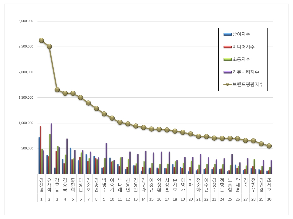 2위 유재석 브랜드는 참여지수 374,384 미디어지수 352,376 소통지수 783,825 커뮤니티지수 992,174가 되면서 브랜드평판지수 2,502,760으로 분석됐다. 지난 8월 브랜드평판지수 3,064,512와 비교하면 18.33% 하락했다.