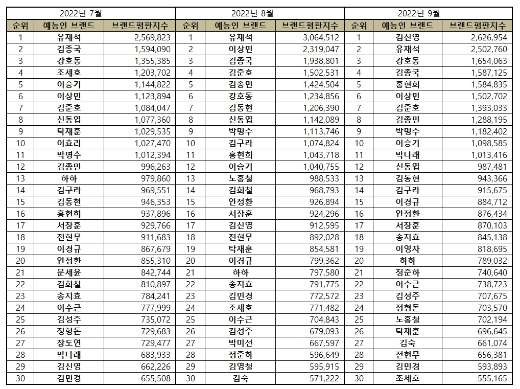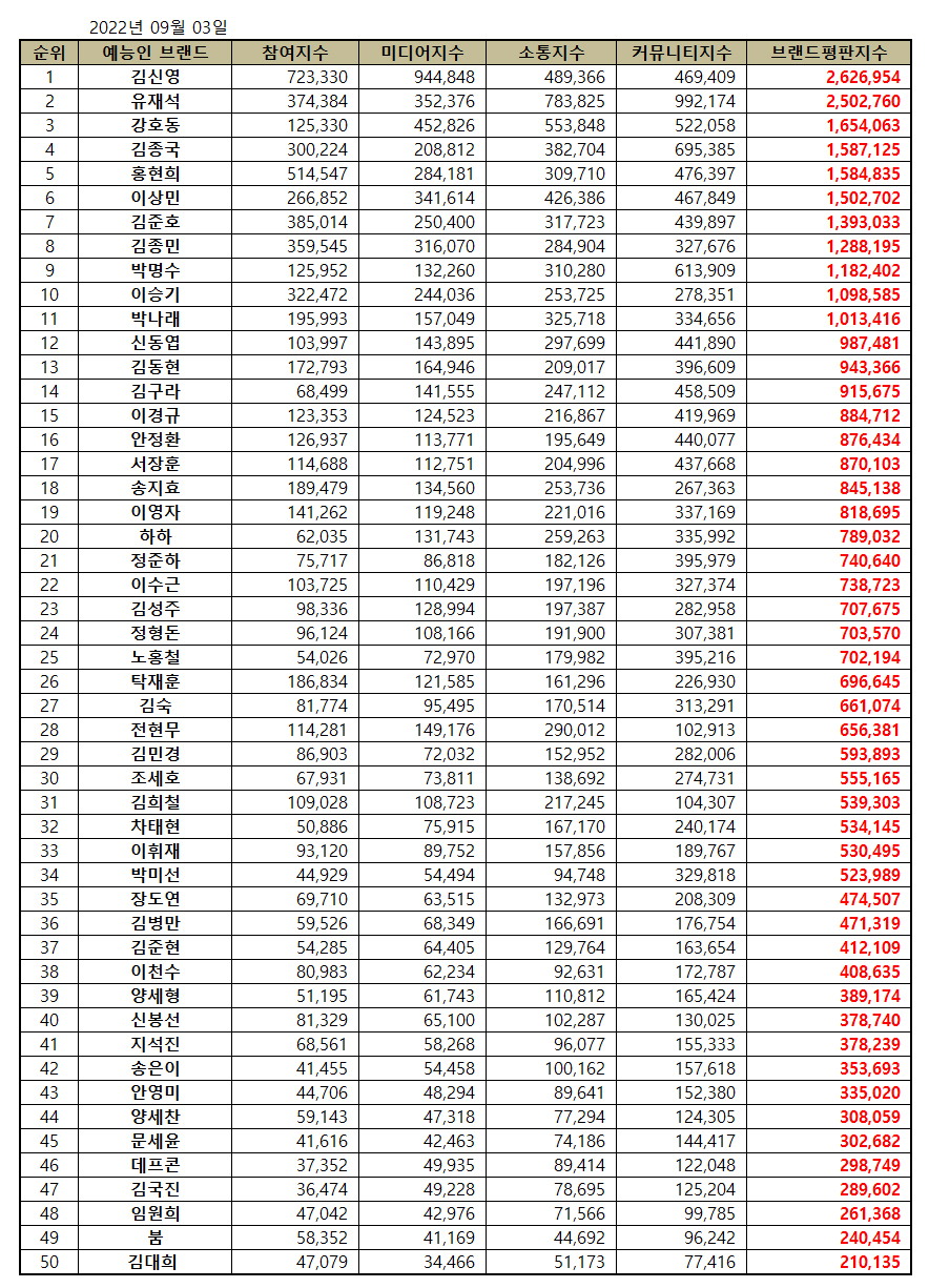 한국기업평판연구소는 2022년 8월 3일부터 2022년 9월 3일까지의 예능인 50명의 브랜드 빅데이터 39,761,082개를 분석하여 소비자들의 예능 방송인 브랜드 참여량, 미디어량과 소비자의 참여와 소통량, 소셜에서의 대화량을 측정했다. 지난 8월 예능인 브랜드 빅데이터 41,505,669개와 비교하면 4.20% 줄어들었다.