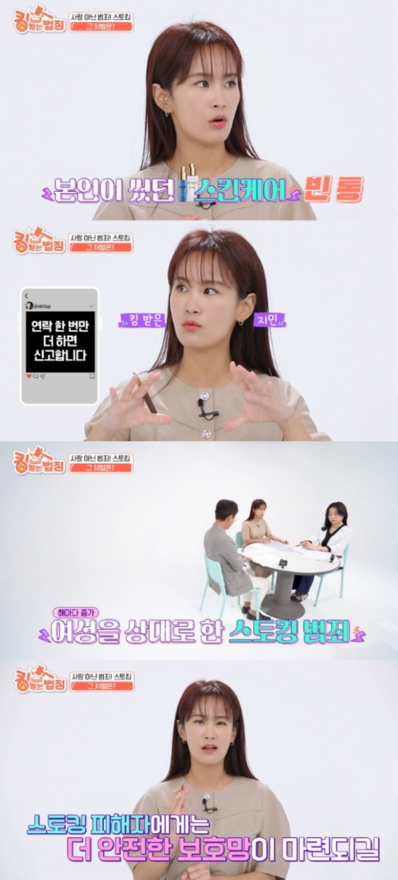 이날 김지민은 스토킹 피해 유형에 대한 설명을 듣던 도중 "우편, 전화, 팩스나 정보통신망을 이용해 물건, 글, 말 등을 도달하게 하는 행위도 스토킹에 해당한다"는 정혜진 변호사 설명을 듣자 "나도 당한 적 있다"며 놀라는 기색을 보였다.
