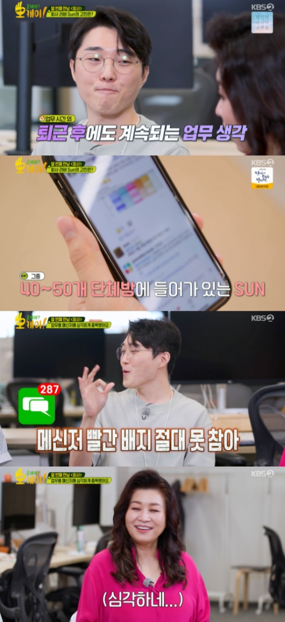 이날 고민의 주인공은 "회사에서 몰입하면서 일을 하고 있는데 집에 가서도 그게 끊어지지가 않는다"라며 회사에 강한 소속감을 가지고 있다고 전했다. 이어 회사의 단체 대화방이 40~50개 정도 된다며 "제 습관이 그런 걸 바로바로 확인해야 되는데 심지어 퇴근 후 공휴일 회사 메신저를 확인한다"며 워라밸도 없어졌다고 전했다.