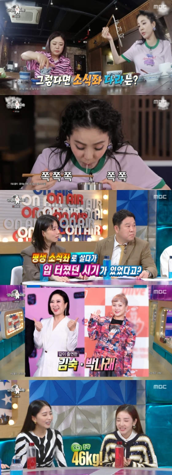 이어 "'비디오스타'를 3~4년을 했는데 김숙과 박나래 씨가 테이블을 꽉 채워 먹더라. 어느 순간 김숙 언니를 따라 아침에 콩나물국밥을 먹었다. 그래서 인생 최대 몸무게 46kg를 달성했다"고 전했다.