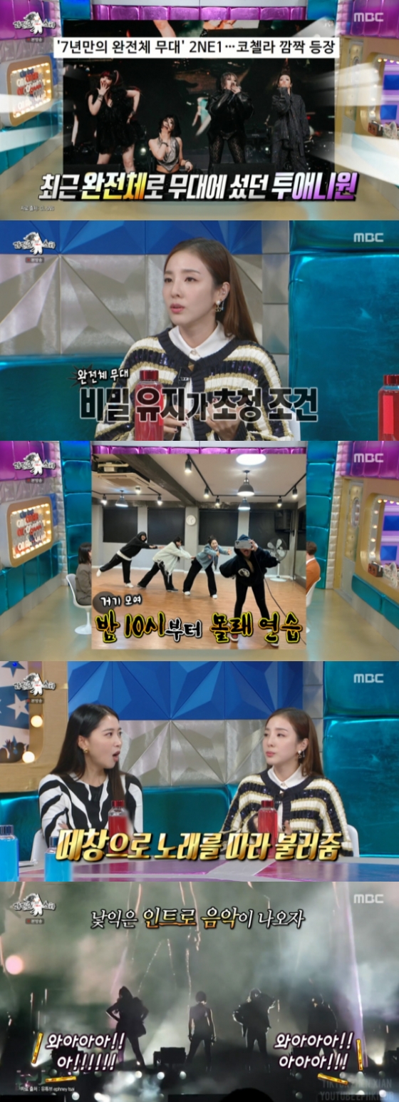 MC 김구라는 산다라박에 "완전체 활동 암시인지 우연한 결합인지"라고 물었다. 산다라박은 "앞으로 활동은 아니다. CL 씨가 코첼라 페스티벌에 초청이 됐었다. 그래서 저희를 모았다. 그동안 사실 7년 동안 오퍼들이 많았다. 하지만 일정이 맞지 않아 항상 어그러졌다. 근데 이번에는 한 번에 OK 됐다"며 완전체로 공연하게 됐다고 전했다.