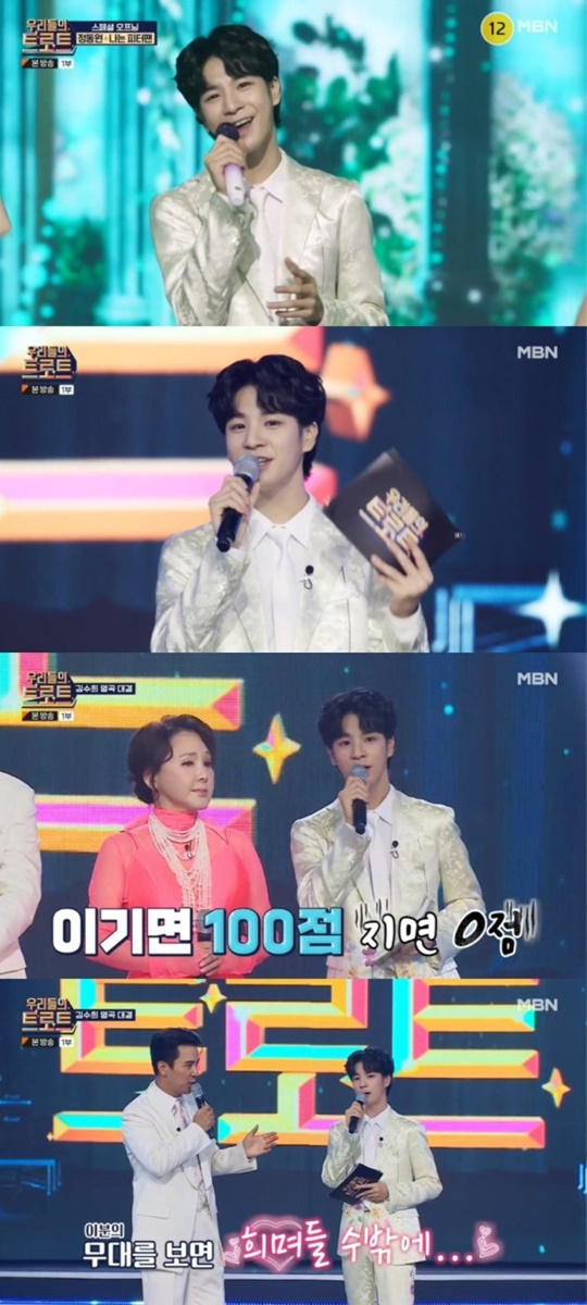 지난 14일 방송된 MBN 예능 프로그램'우리들의 트로트'에 정동원이 MC로 출연했다. 정동원은 '나는 피터팬'으로 등장해 오프닝을 장식했다.
