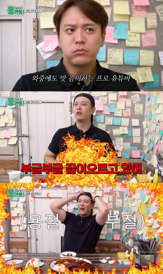 잠시 후 매운 돈가스가 등장하고, 검붉은 소스로 뒤덮인 돈가스의 위협적인 자태에 긴장한 표정으로 먹방을 시작한 김용준은 급격하게 올라오는 불같은 화끈함에 안절부절하며 땀을 뻘뻘 흘리기 시작했다.