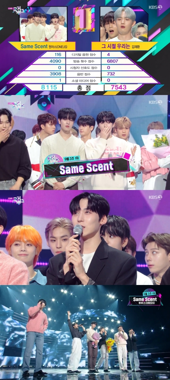 16일 방송된 KBS 2TV '뮤직뱅크'에서는 원어스의 'Same Scent'가 김재환의 '그 시절 우리는'을 누르고 1위를 차지했다.