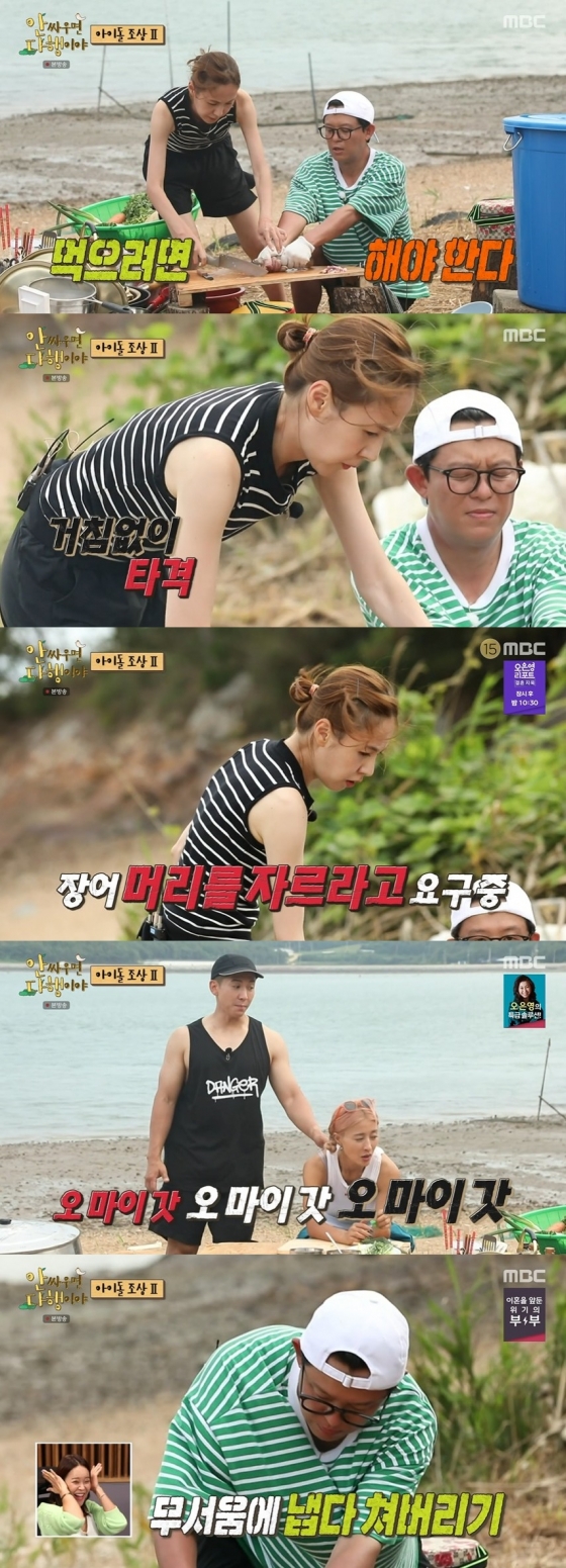 한편 간미연은 토니안에게 장어 손질을 재촉했다. 간미연은 큰 칼을 토니안에게 건네며 "그냥 머리 잘라. 머리 잘라. 머리 자르면 돼요"라며 섬뜩하게 말했다. 이에 브라이언은 "근데 미연이가 말하는 게 너무 냉정하다"라며 시원한 성격에 감탄했다.