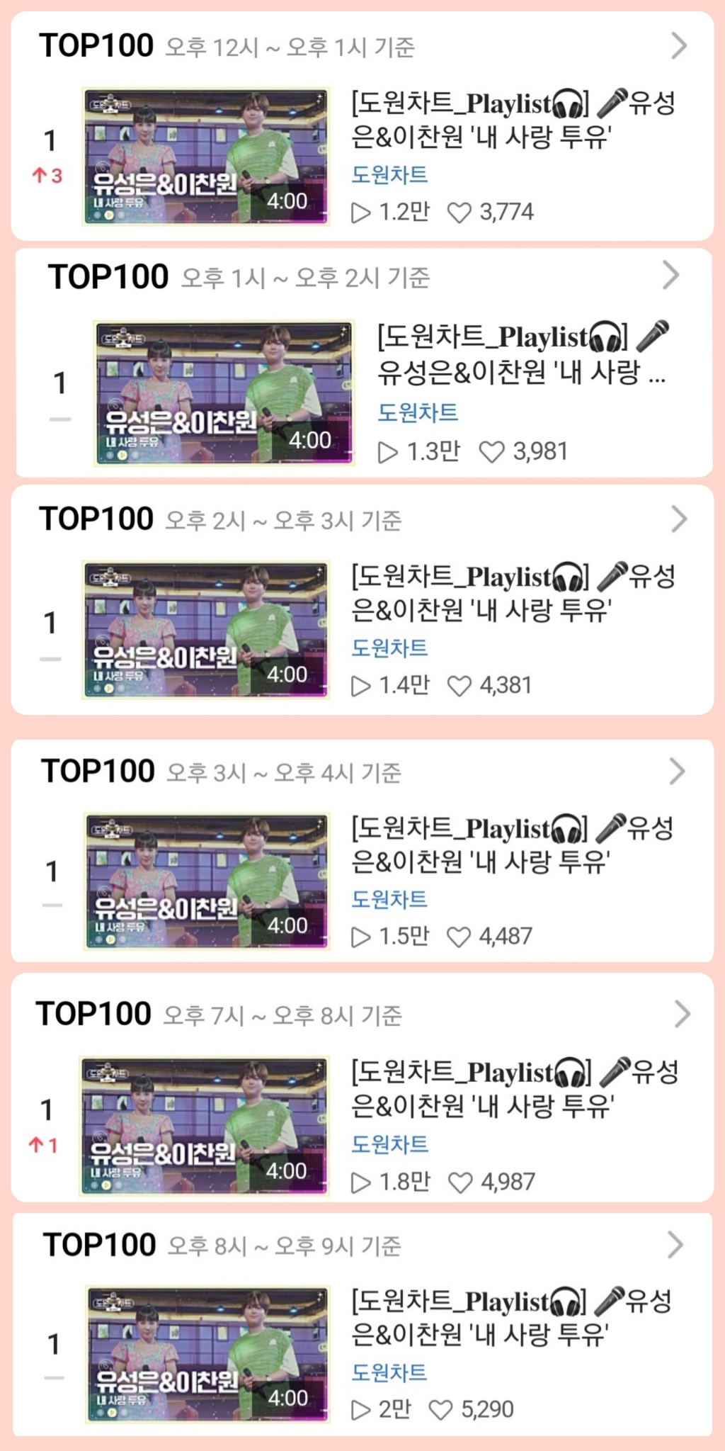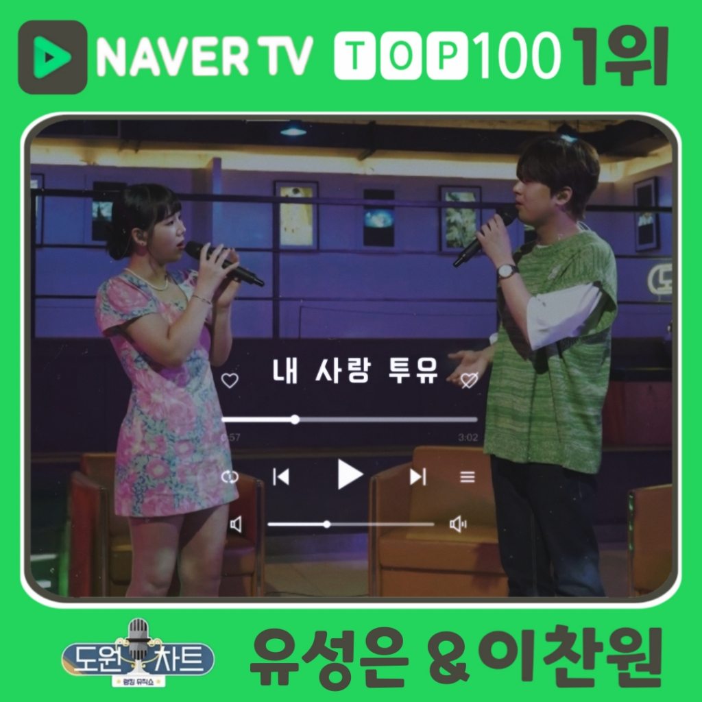 이찬원과 유성은이 K-STAR '도원차트'에서 선보인 '내 사랑 투유' 듀엣 무대 영상은 9월 20일 낮 12시부터 오후 4시까지 4시간 연속 네이버 TV 1위를 차지했다. 영상은 이날 오후 7시~오후 9시 기준 다시 네이버TV 1위를 기록하며 총 6시간 네이버 TV 1위 기록을 세웠다.
