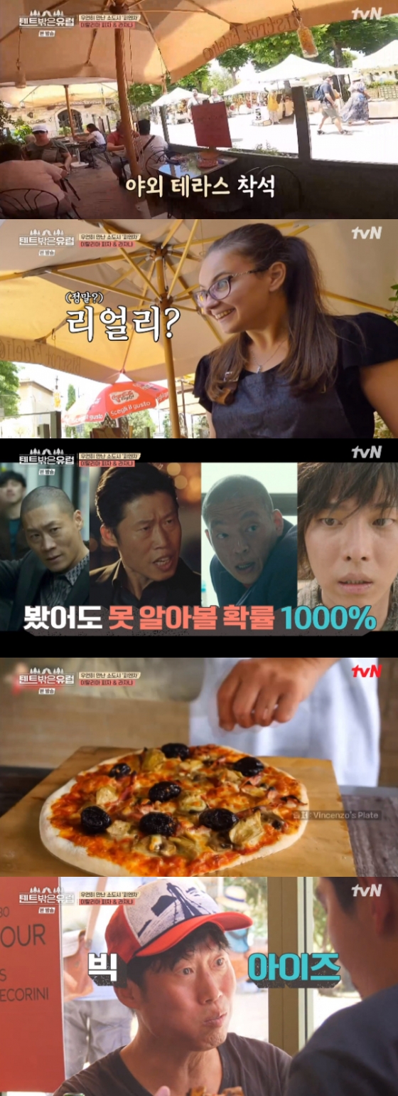 21일 오후 방송된 tvN 예능프로그램 '텐트 밖은 유럽'에서는 멤버들(유해진, 진선규, 박지환, 윤균상)이 토스카나 소도시 피엔차에서 피자와 라자냐를 즐겼다.